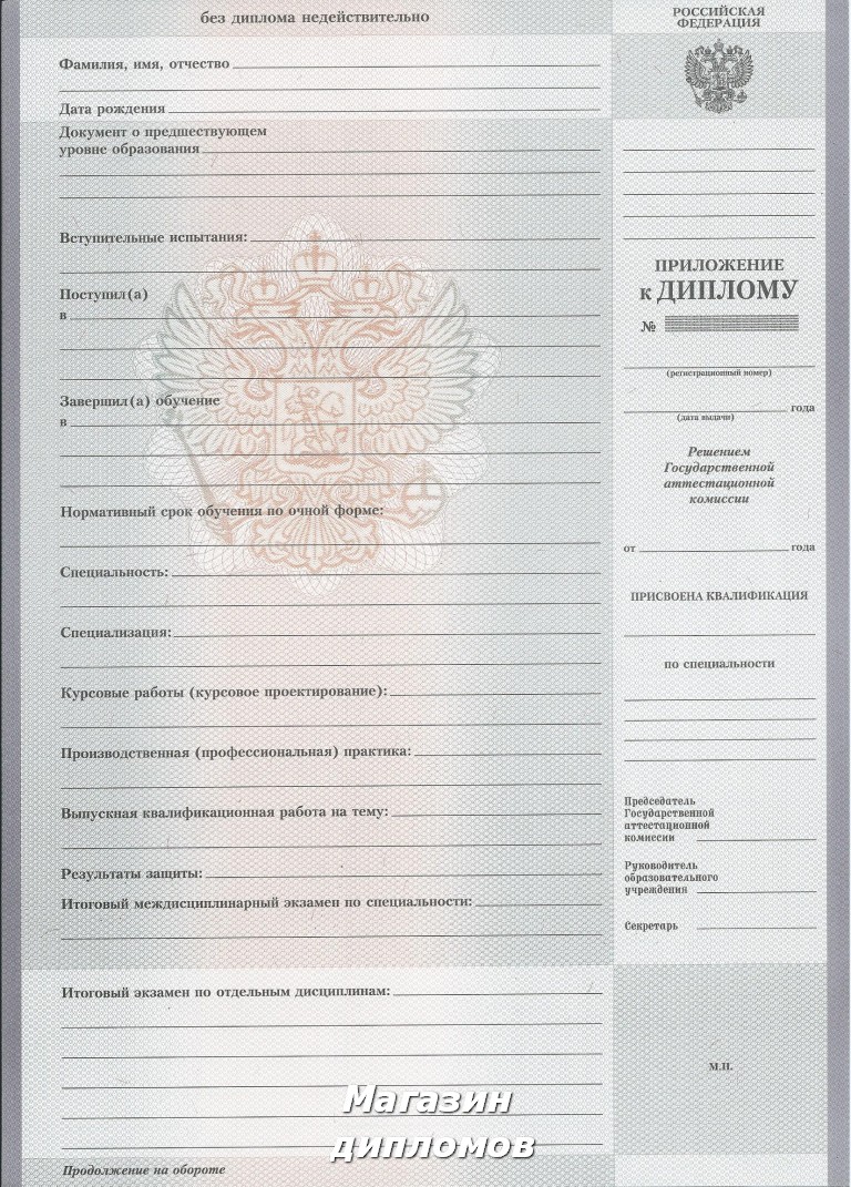 Диплом, это официальный документ, к которому выдвигаются соответствующие требования. Он должен быть заполнен только на бланке государственного образца фабрики ГОЗНАК, на котором в обязательном порядке присутствуют строго установленные средства защиты от подделок: водяные знаки, микрошрифт, светящиеся при ультрафиолете волокна и индивидуальный номер.